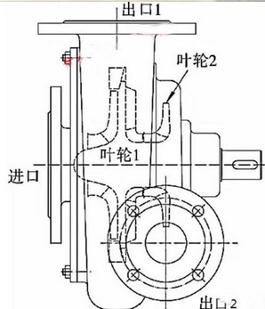 藍升水泵今天就介紹一種解決這種問題的方法,一種新型的水力結構形式誕生啦!它遵循著泵的基本方程,擁有著原有結構的基本特征,但是與眾不同的是它卻有著兩個葉輪和兩個“出口”,首先讓“新生兒”亮個相。