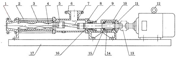 G型單螺桿泵工作原理與特性: G型單螺桿泵是按迥轉(zhuǎn)嚙合容積式原理工作的新型泵種。主要工作部件是偏心螺桿(轉(zhuǎn)子)和固定的襯套(定子)。由于該部件的特殊幾何開頭分別形成單獨(dú)的密封容腔。介質(zhì)由軸向均勻推行流動(dòng)。內(nèi)部流速代低,容積保持 不變。壓力穩(wěn)定,因而不會(huì)產(chǎn)品渦流和攪動(dòng)。 單螺桿泵被廣泛用于各行業(yè)輸送各類介質(zhì),恒壓連續(xù)運(yùn)行,無脈動(dòng),介質(zhì)輸送無破損,通過調(diào)節(jié)轉(zhuǎn)速改變流量從而達(dá)到計(jì)量的目的。本產(chǎn)品適合輸送具有以下特性的介質(zhì):固體含量高(最大粒徑可達(dá)150mm)或無固體含量|各種粘度(1mPas-3百萬mPas)的介質(zhì).觸變性和易膨脹性介質(zhì).剪切敏感性介質(zhì).磨蝕性介質(zhì).有/無自潤滑性的介質(zhì)|腐蝕性介質(zhì)(pH=O-14).粘結(jié)性介質(zhì).有毒性介質(zhì).流量大、壓力高.流量范圍從每小時(shí)幾毫升到500m3(2200gpm).壓力范圍最高可達(dá)48bar,特殊設(shè)計(jì)可達(dá)72bar。同一種傳動(dòng)部件可與四種不同設(shè)計(jì)的轉(zhuǎn)子/定子匹配,為您提供使用方案。 針對(duì)不同的應(yīng)用領(lǐng)域,選用不同的金屬材料,從鑄鐵、鎳鉻鋼到耐酸材料、哈氏合金及鈦合金。彈性材料可選用耐磨的、耐油的、耐酸的、耐堿的橡膠,如天然橡膠、丁晴橡膠、乙丙橡膠及氟橡膠等。對(duì)磨蝕性強(qiáng)的介質(zhì),可選用陶瓷或塑料。當(dāng)介質(zhì)因高溫或含有某些化學(xué)成分而不能選用彈性材料時(shí),可選用硬材質(zhì)定子或剛性定子。各種軸封形式:按客戶的要求,機(jī)械密封從單端面機(jī)封(帶或不帶急冶)、雙端面機(jī)封(背靠背式及串聯(lián)式機(jī)械密封)到盒式密封;也可選用填料密封、水封環(huán)及特殊密封。對(duì)有毒介質(zhì)可提供無泄漏磁力傳動(dòng)。 G型單螺桿泵結(jié)構(gòu)圖: