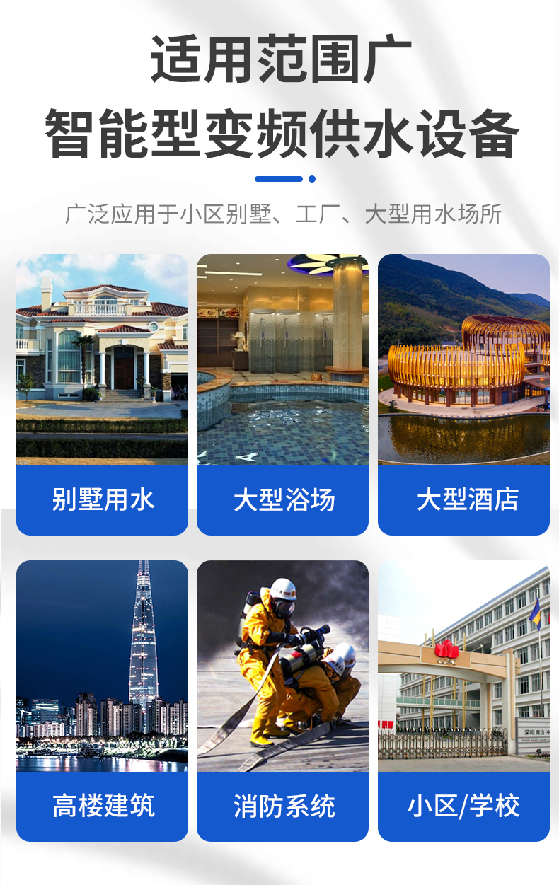 1、新建的住宅小區(qū)、別墅、寫字樓、綜合樓生活供水。2、高層建筑、消防用水、高級賓館飯店等的生活供水。