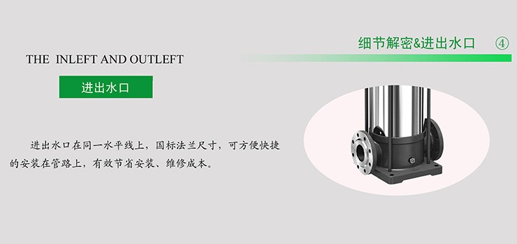 5、多級(jí)泵的進(jìn)水口與出水口位于泵座同一水平線(xiàn)上,可直接用于管路當(dāng)中。